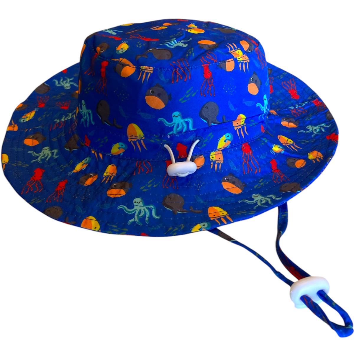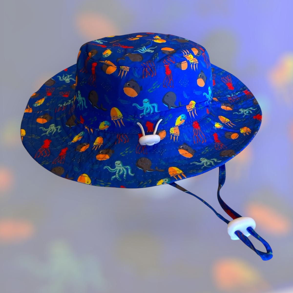 Proteja seu pequeno do sol com este adorável chapéu infantil em azul royal, decorado com um encantador padrão marinho de polvos, baleias e outras criaturas do oceano em cores vibrantes como laranja, vermelho e turquesa. O chapéu possui aba larga para maior proteção solar e um prático cordão ajustável com travas brancas que permite um ajuste perfeito, evitando que o chapéu voe com o vento. Ideal para dias de praia, piscina ou qualquer atividade ao ar livre, este chapéu combina proteção com estilo lúdico que as crianças adoram. O tecido resistente e o acabamento de qualidade garantem durabilidade para todas as aventuras do seu filho. O design versátil e divertido torna este chapéu um acessório indispensável para o guarda-roupa infantil.