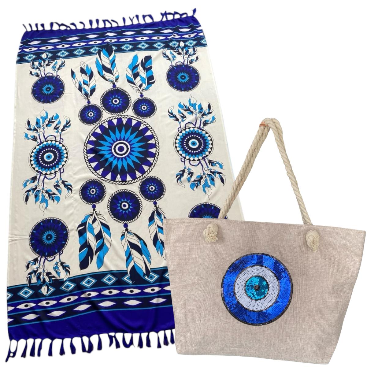 Conjunto de Canga de Praia com Franja e Bolsa de Praia Olho Grego com detalhe em Paetê