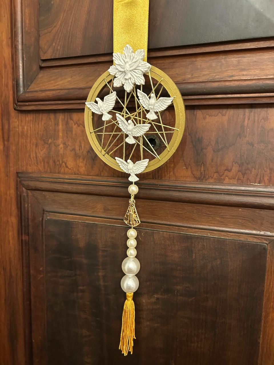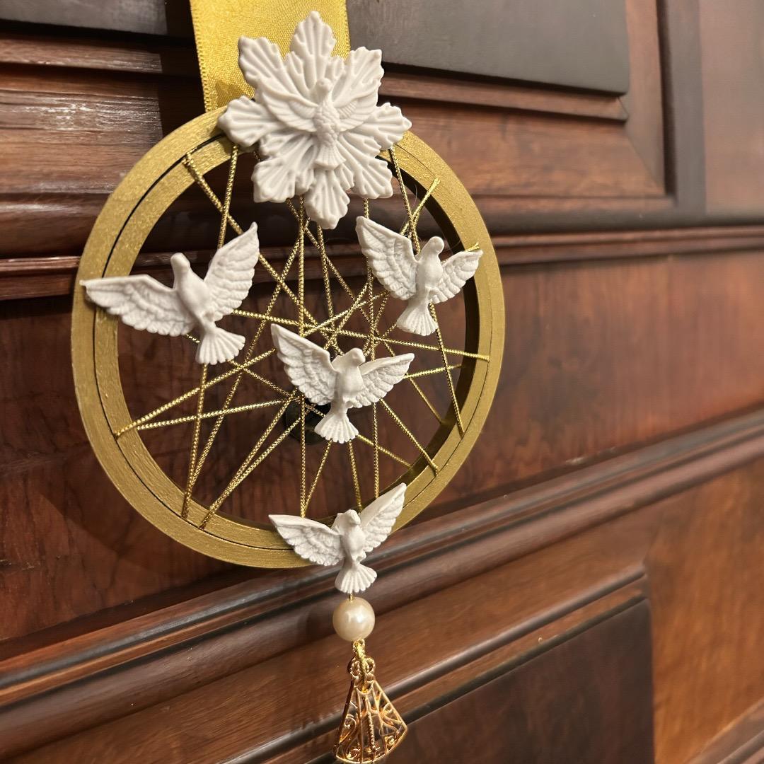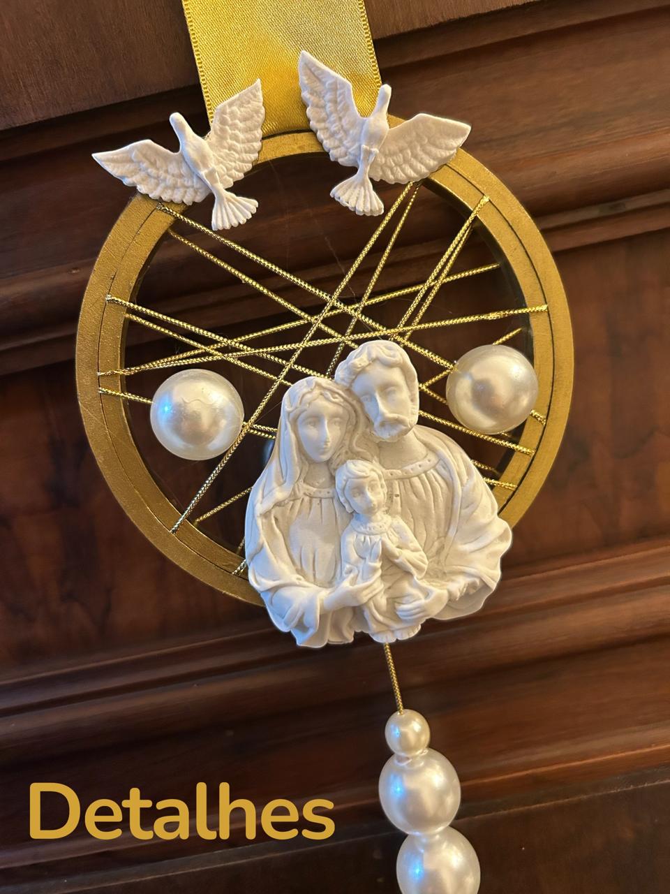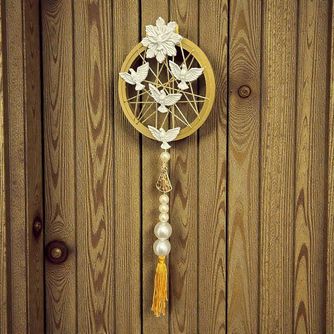 Design Artesanal: Peça decorativa com círculo dourado, pombas brancas representando o Espírito Santo, flor delicada no topo e detalhes em relevo que agregam sofisticação