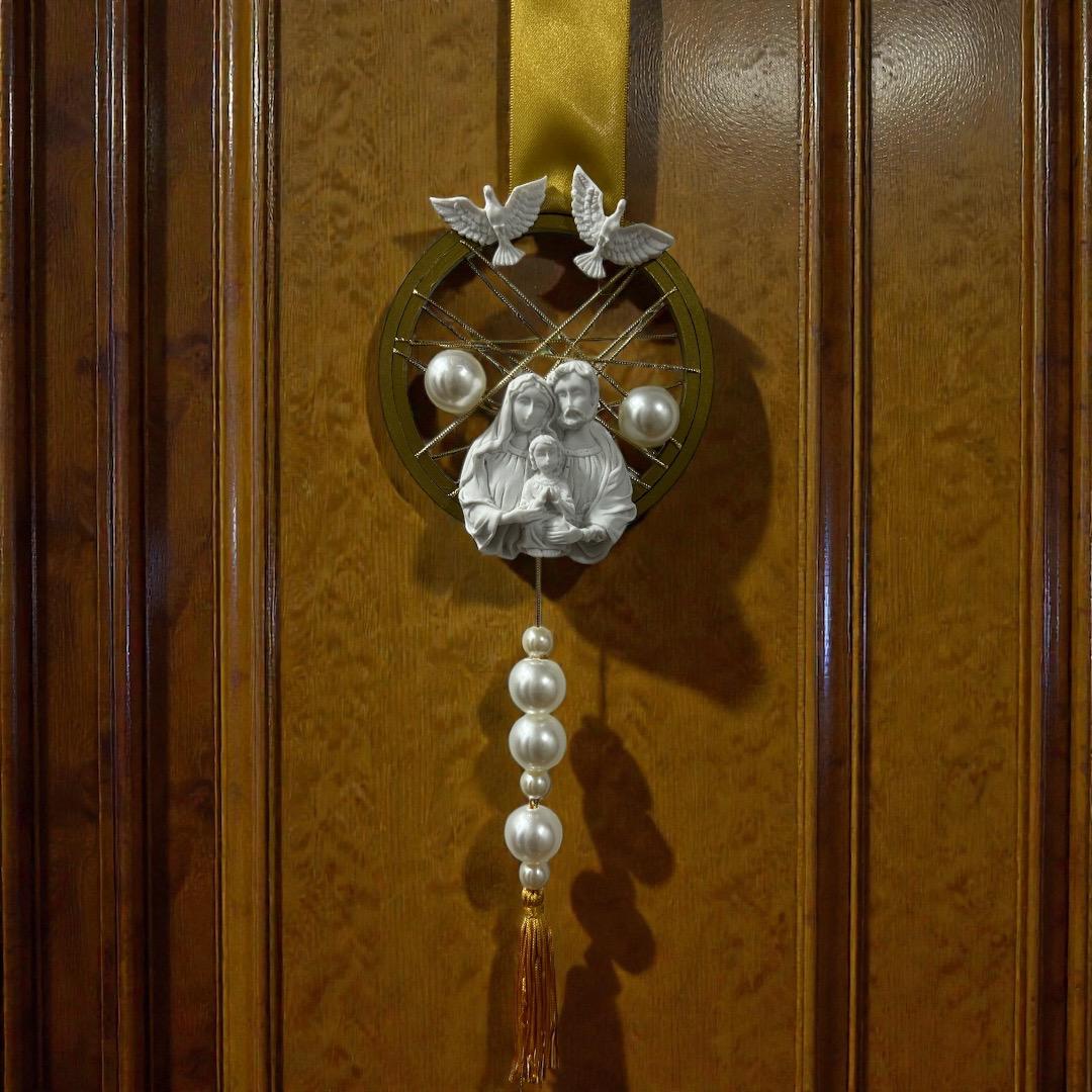 Este elegante escapulário de porta dourado é uma bela peça de decoração religiosa católica que traz significado espiritual e sofisticação para qualquer ambiente. Apresentando detalhes delicados do Espírito Santo representado pela pomba branca e elementos florais em relevo, esta fita de porta combina fé e arte de forma harmoniosa. O design circular dourado emoldura os símbolos sagrados, enquanto o pendente ornamental com pérolas e tassel dourado adiciona um toque de refinamento. Perfeito para decorar portas, paredes ou criar um cantinho de oração em sua casa, este escapulário é uma expressão de devoção a Nossa Senhora Aparecida e ao Espírito Santo. A combinação de tons dourados e brancos confere elegância atemporal, tornando esta peça adequada para diversos estilos de decoração. Ideal como presente significativo para ocasiões especiais como batizados, crismas, casamentos ou simplesmente para demonstrar carinho a alguém especial. Transforme seu lar em um espaço de paz e espiritualidade com esta linda decoração religiosa.