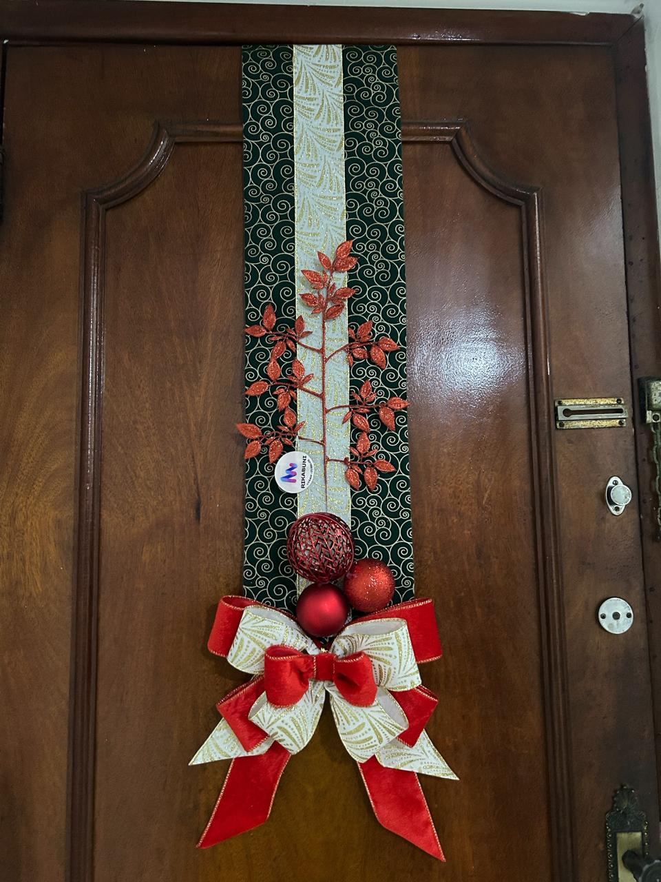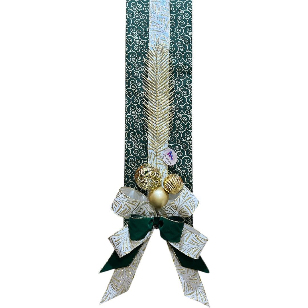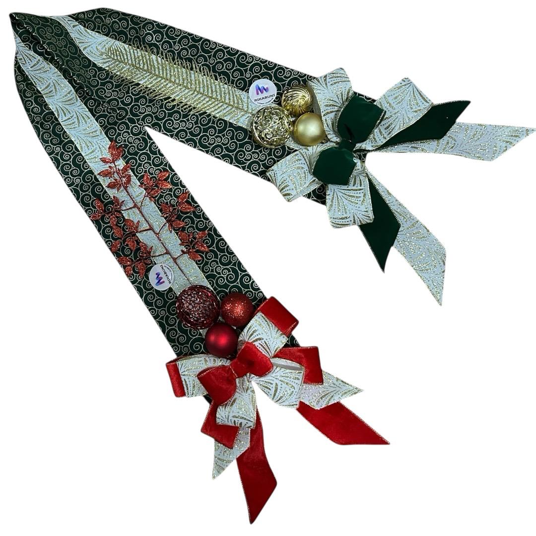 Transforme sua decoração natalina com este luxuoso escapulário verde da RIKABUNI. Confeccionado em tecido premium de alta qualidade, este ornamento pendente apresenta um design sofisticado com laços em veludo que adicionam um toque de elegância. O que torna esta peça verdadeiramente especial é a decoração única em cada extremidade - uma ponta é decorada com bolas douradas e a outra com bolas vermelhas, criando um contraste deslumbrante. O padrão em espiral dourado no fundo verde escuro adiciona profundidade e sofisticação ao design. Os laços em veludo, em verde e vermelho, complementam perfeitamente a estética festiva, enquanto as bolas natalinas cuidadosamente posicionadas proporcionam um acabamento luxuoso. Este escapulário é perfeito para decorar portas, janelas ou qualquer espaço que precise de um toque natalino elegante e diferenciado.