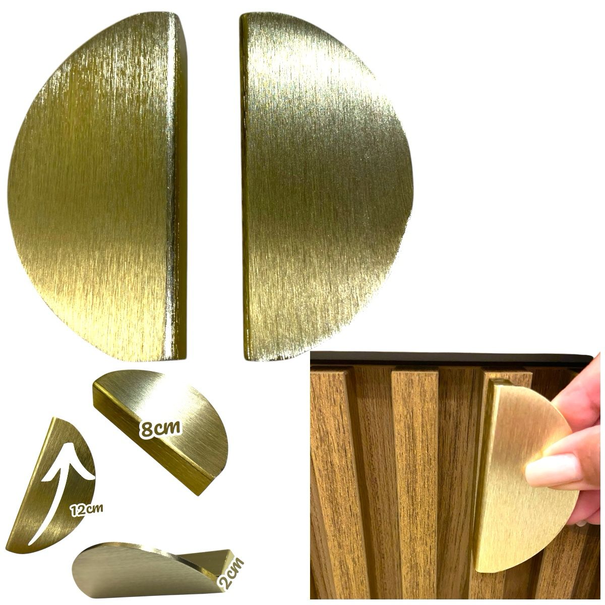 DIMENSÕES: Puxador meia lua com 12 cm de comprimento, 8 cm de largura e 2 cm de profundidade, ideal para móveis diversos