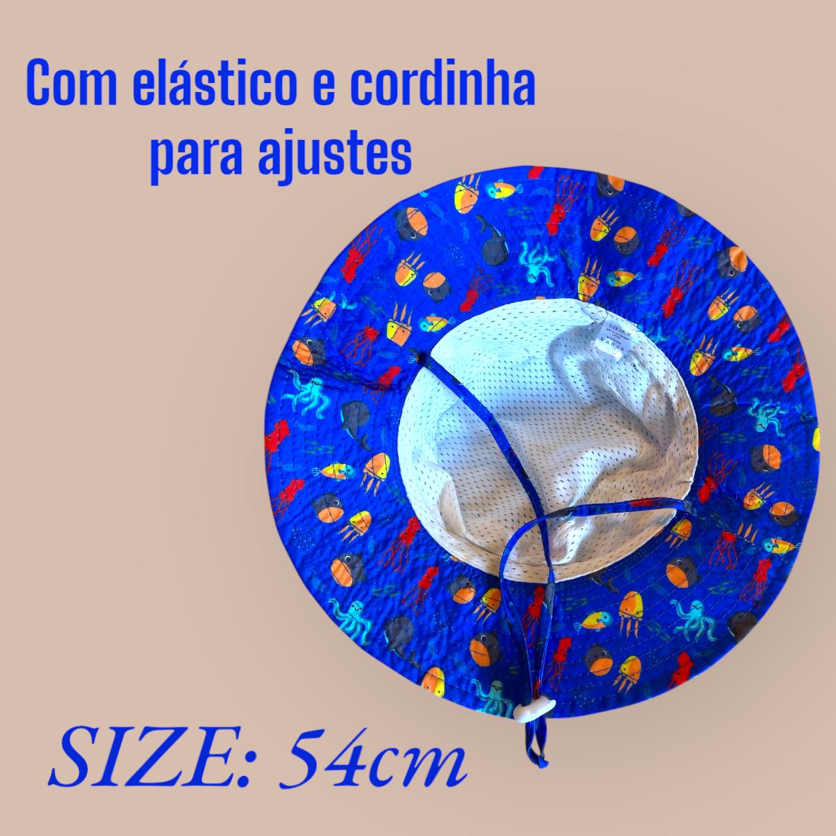 Proteja seu pequeno do sol com este adorável chapéu infantil na cor Azul Royal com desenhos temáticos do fundo do mar. O chapéu possui aba larga para maior proteção solar e um prático cordão ajustável com travas brancas que permite um ajuste perfeito, evitando que o chapéu voe com o vento. Ideal para dias de praia, piscina ou qualquer atividade ao ar livre, este chapéu combina proteção com estilo lúdico que as crianças adoram. O tecido resistente 100% poliéster e o acabamento de qualidade garantem durabilidade para todas as aventuras do seu filho. O design versátil e divertido torna este chapéu um acessório indispensável para o guarda-roupa infantil.