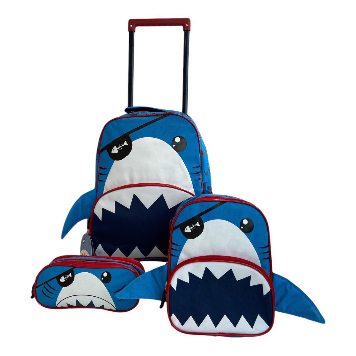 Kit Mochila Rodinha Lancheira Estojo Tubarão